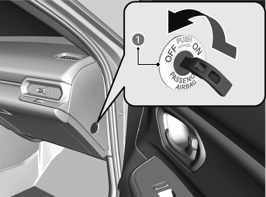 - Use your vehicle's built-in key to turn the passenger front airbag ON/OFF switch. If you use a different key, the switch can be damaged, or the passenger front airbag system may not work properly.
