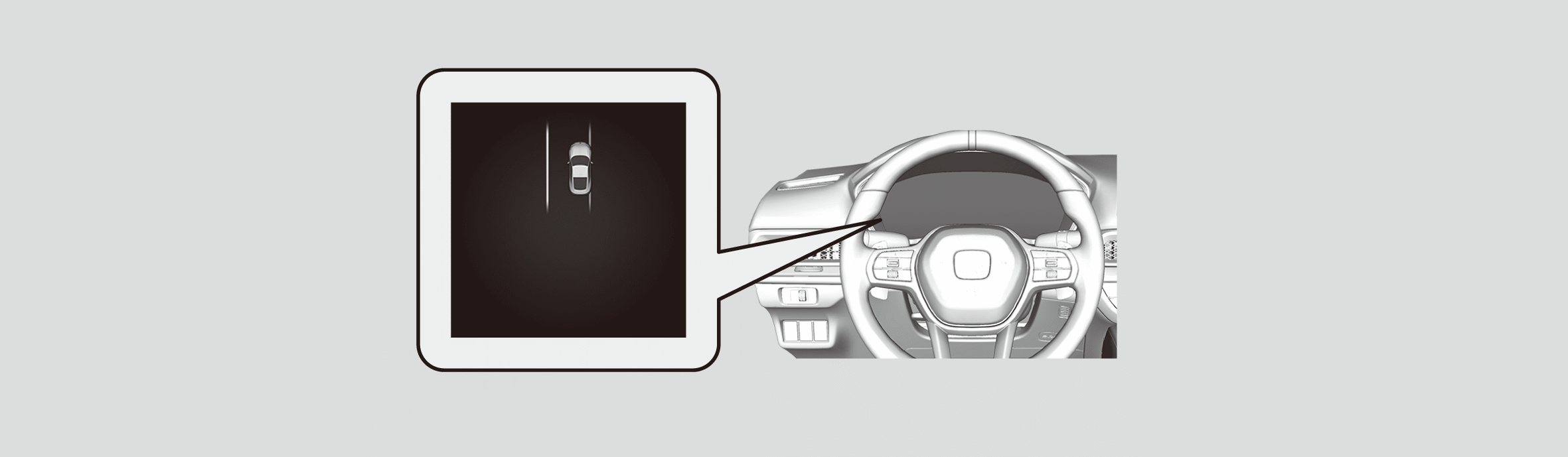 The system assists with both steering operation and maintaining lane-keeping by detecting the left and right white (or yellow) lines using the front wide view camera when the vehicle is driving near the centre of the lane.