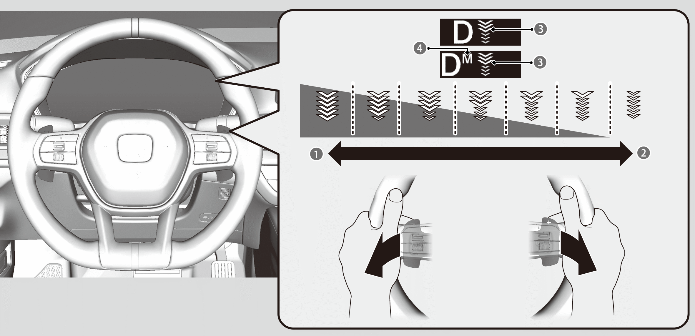 When Honda S+ Shift is turned on, the deceleration rate set with the paddle will change.
